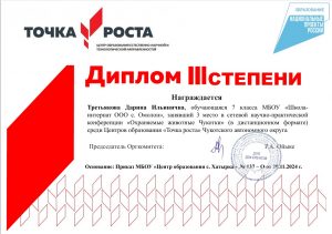Ученица 7 класса МБОУ «ШИ с. Омолон» Третьякова Дарина награждена дипломом III степени в сетевой научно — практическая конференция «Охраняемые животные Чукотки», который проходил в дистанционном формате на площадке Центра образования естественно-научного направления «ТОЧКА РОСТА» на базе МБОУ «Центр образования с.Хатырка»