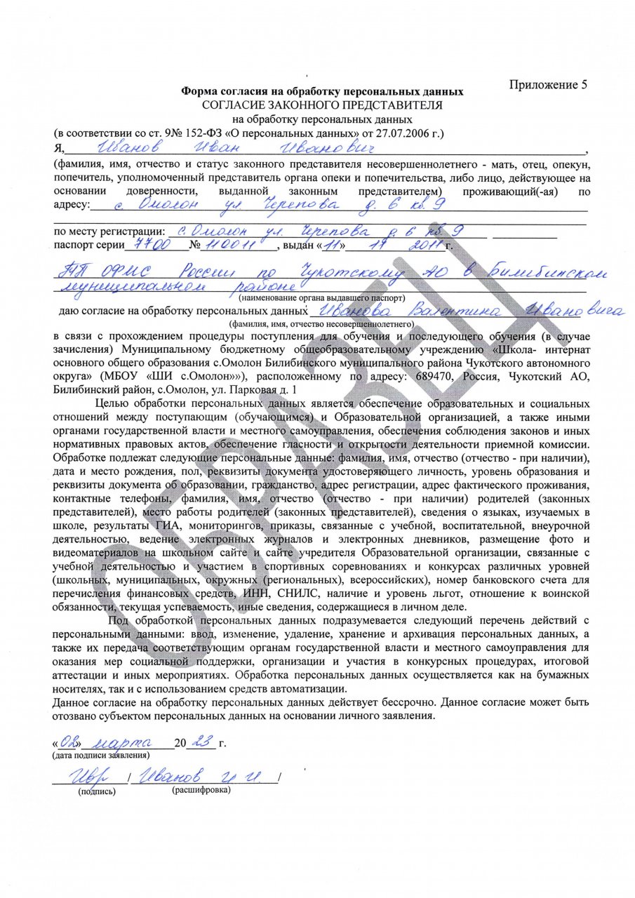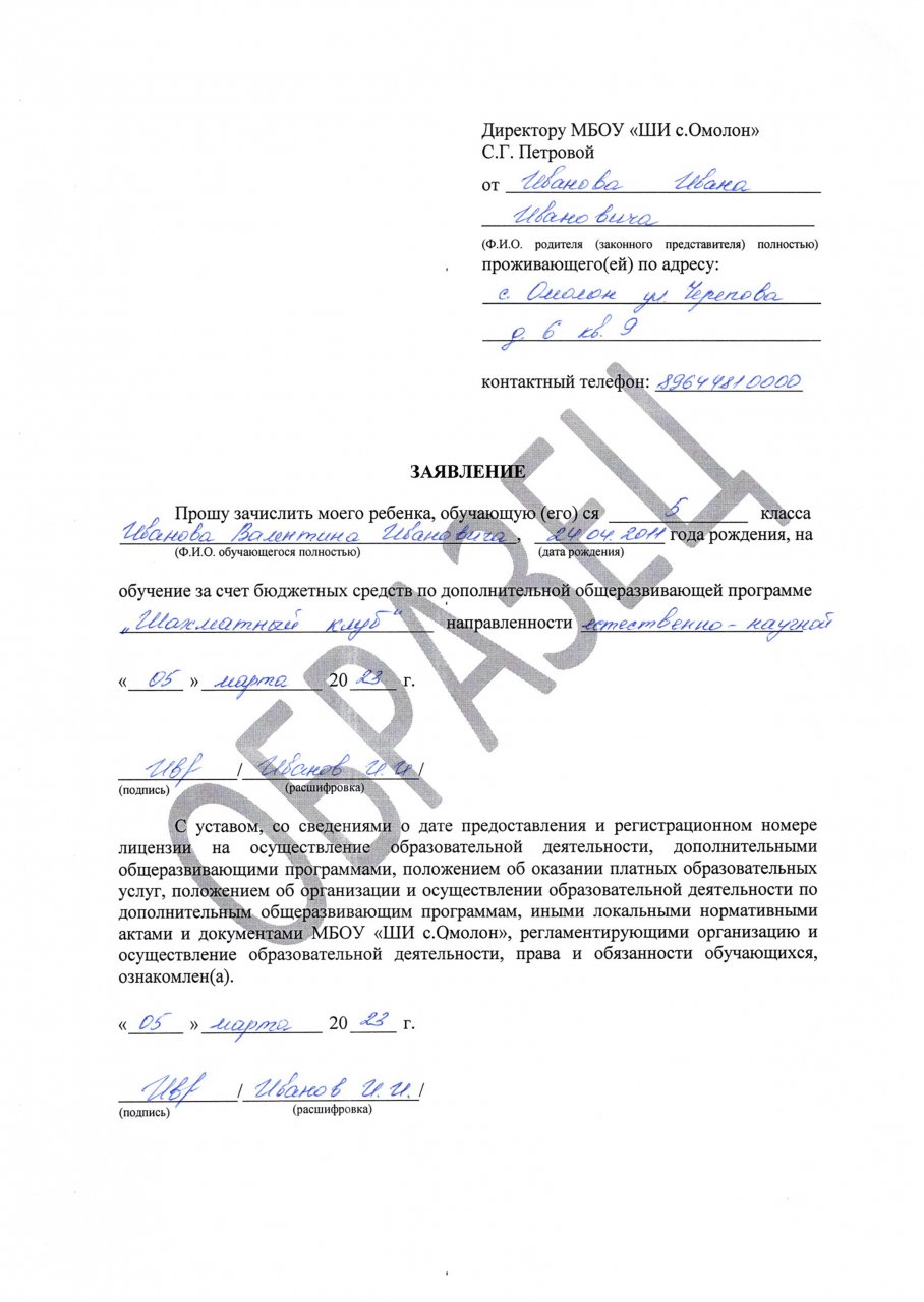Форма заявления родителей (законных представителей) о зачислении обучающегося в МЮОУ «ШИ с. Омолон» по дополнительной общеразвивающей программе
