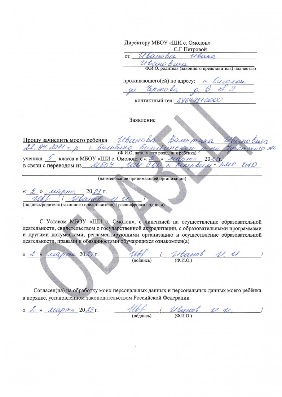 Форма заявления родителей (законных представителей) о зачислении обучающегося в МБОУ «ШИ с. Омолон» в порядке перевода