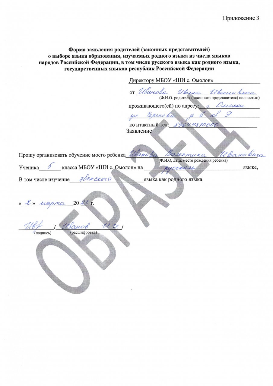 Форма заявления родителей (законных представителей) о выборе языка образования
