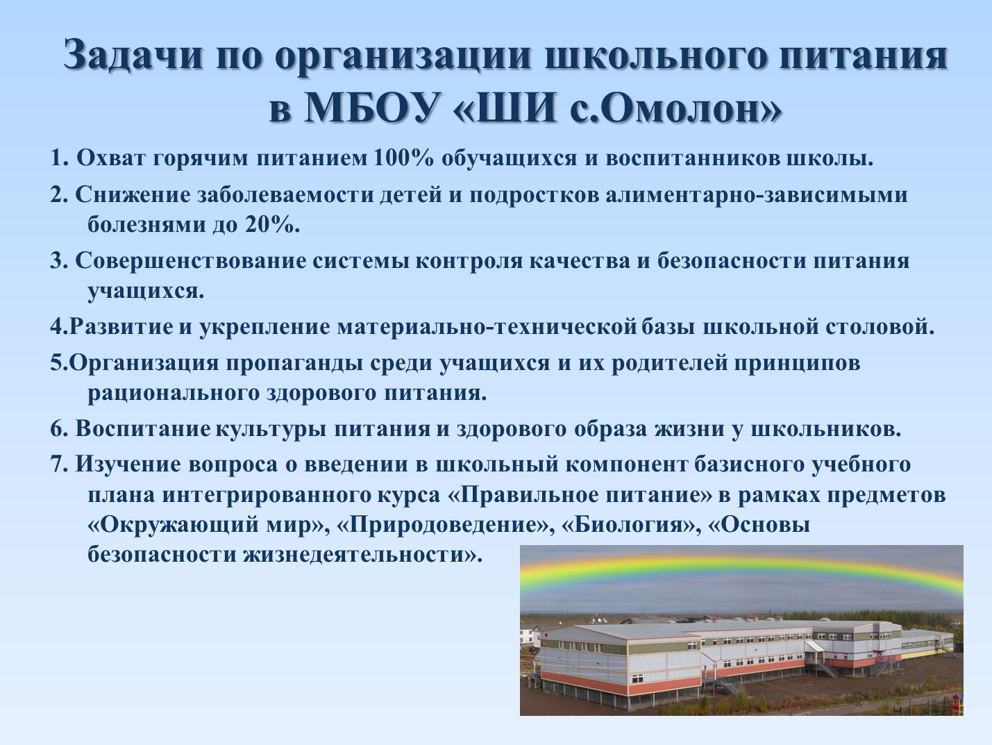 Питание учащихся Муниципального бюджетного общеобразовательного учреждения «Школа- интернат основного общего образования с.Омолон Билибинского муниципального района Чукотского автономного округа» обеспечивает школьная столовая (пищеблок), в которой осуществляется полное приготовление и реализация блюд.