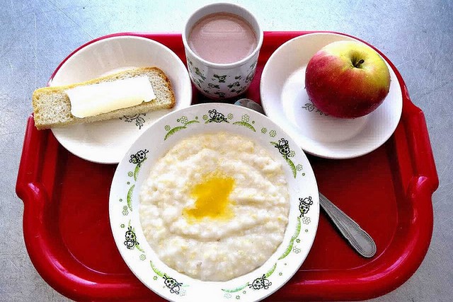 Основным является горячее блюдо. Чаще всего школьникам предлагается молочная каша, творожная запеканка или омлет с различными добавками. Размер порции соответствует физиологическим потребностям учащихся.